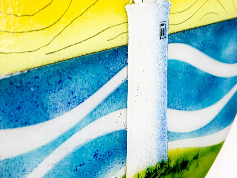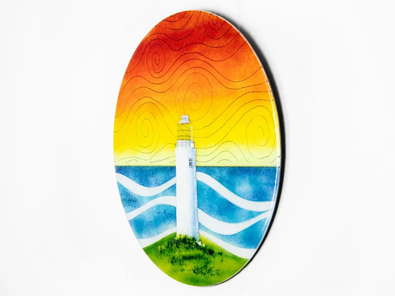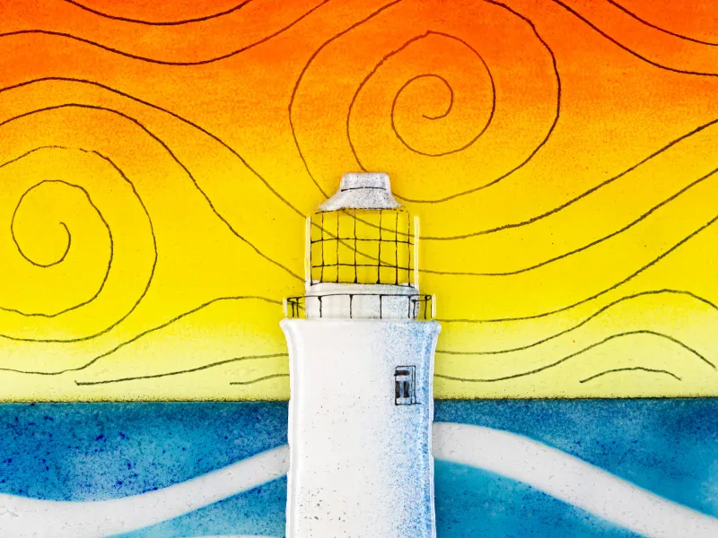 This exquisite hand-made fused glass circular panel captures the serene beauty of a lighthouse during a vibrant sunrise. This Artisan design has the most gorgeous colour-way, creating depth and movement that bring the scene to life. In addition, this piece has been placed onto mirror glass, creating a shimmering effect in the light.