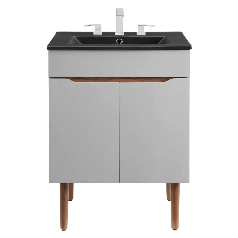Instill the whispered elegance required to full your bathroom decor with the Harvest 24″ Mid-Century Modern Bathroom Vanity. The Harvest Bathroom Vanity features a durable MDF frame with a matte finish laminate, four tapered mahogany wood legs, two spacious drawers, and ample storage space behind two soft-close hinged doors. A ceramic sink basin with an integrated countertop and 8″ centerset faucet holes continues the sleek look. Scandinavian modern style makes for a quietly bold vanity designed for a multitude of decor styles. This vanity has solid construction with a cutaway design on top of the dual doors and drawers for easy open and close functionality. Assembly required and fixtures not included.