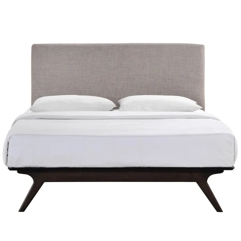 Transform your ordinary bedroom arrangements into a more compelling décor with the Tracy full size platform bed. Made of sturdy MDF boards, Tracy with its open design and platform leg support, proves that elegance doesn’t need to come at the expense of simplicity. Finely upholstered with a foam padded fabric headboard, Tracy is an painless to maintain toffee brown stained piece that admirably delivers both comfort and style. Tracy requires assembly, and should be spot cleaned only. Headboard included. Full size mattress not included. The Tracy Full size platform bed does not need a boxspring.