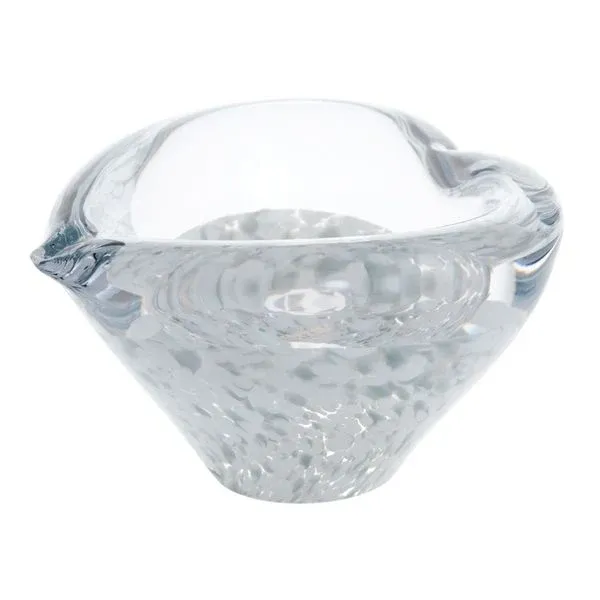 A beautiful heart-shaped glass bowl with a pattern of metallic gray flakes in the base. Can be used as a trinket dish, paperweight, or both!