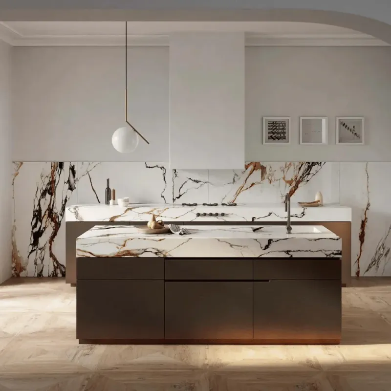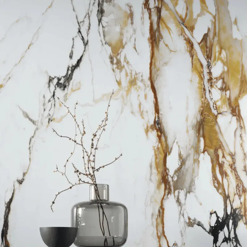 Ce matériau haut de gamme, mélangeant des teintes d’ivoire, caramel, sauge et merlot avec des éclats dorés, offre une esthétique riche et captivante, rappelant l’élégance sophistiquée de l’effet marbre blanc.