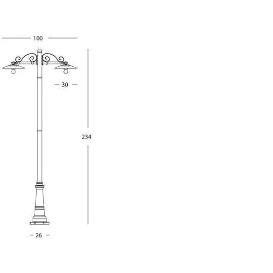 Struttura in pressofusione di alluminio. Piatti verniciati e smaltati bianco. Dima per il fissaggio a terra, dispositivo di connessione e accessori per il fissaggio. Portalampada in porcellana con attacco E27. Copri portalampada con guarnizione in gomma siliconica. Adatta per lampade a risparmio energetico con protezione in silicone. Lampada esclusa. Alimentazione 230V ~ 50Hz. Classe di protezione: IP43 Numero lampade: 2 Potenza massima lampade: 25W