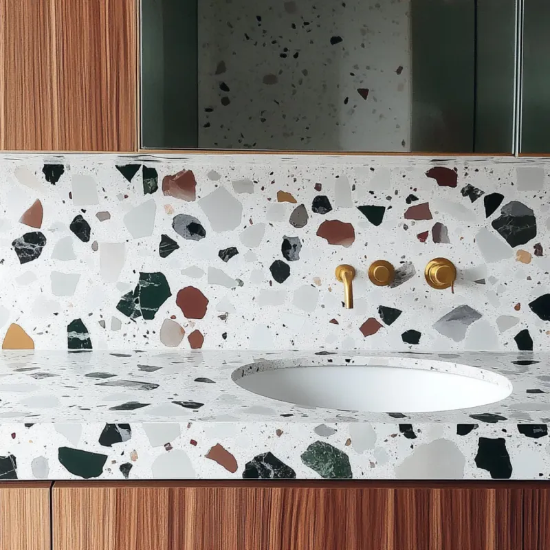 - Résistance et durabilité : Idéal pour un environnement humide, le terrazzo ne craint ni l’eau ni les produits cosmétiques.