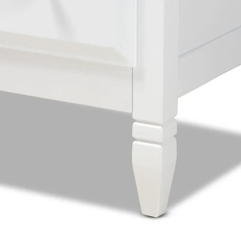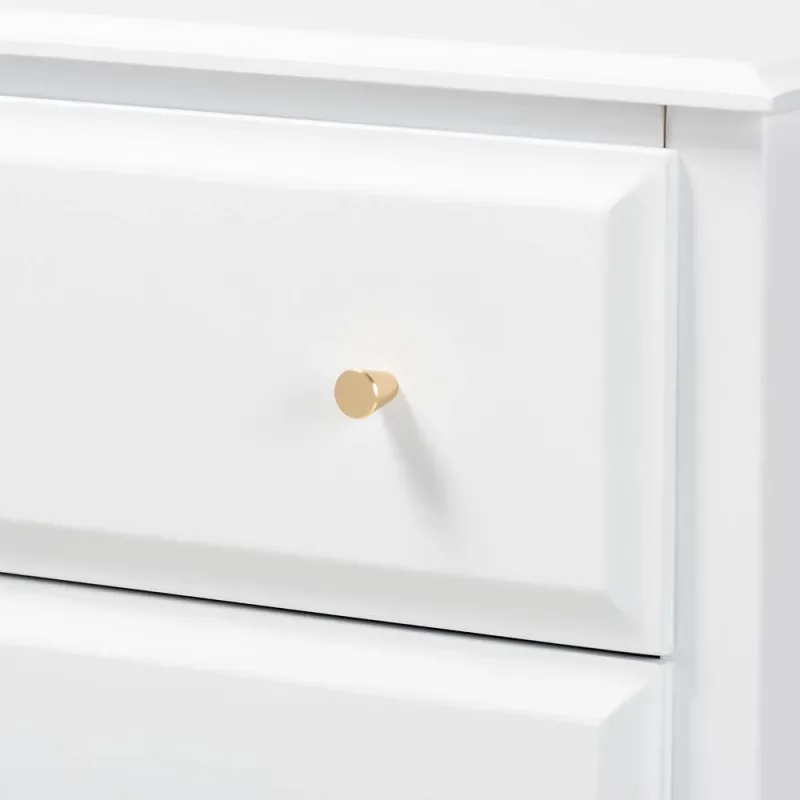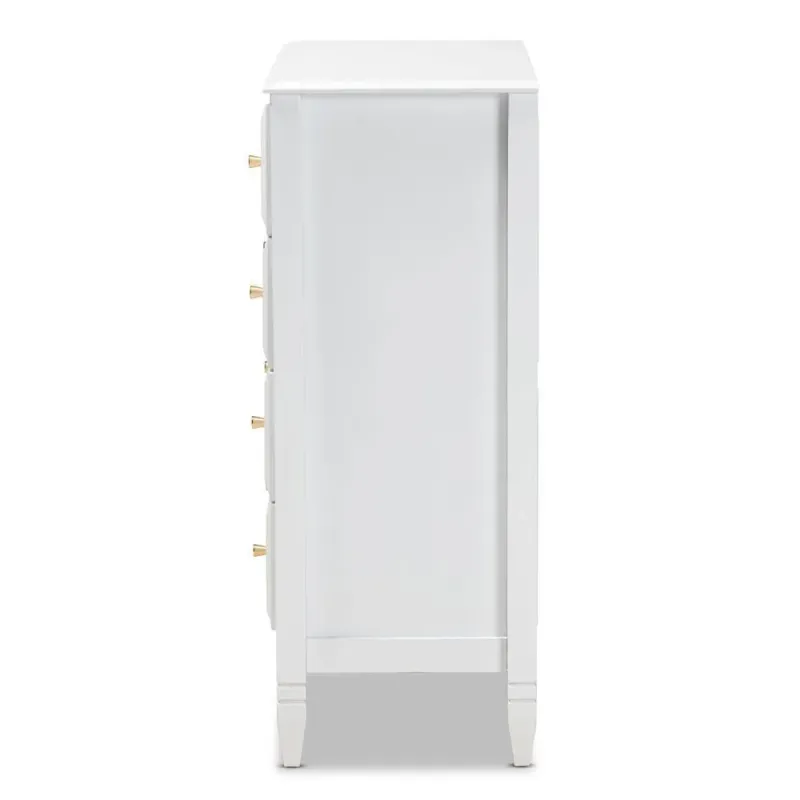 A classic silhouette receives a glamorous update in the Naomi chest. Made in Malaysia, this wooden chest displays a polished snow finish that brightens any space. The countertop is well suited for a lamp and trinkets, while four drawers provide ample storage space for clothing and linens. Each drawer is adorned with a striking gold-tone knob that adds a touch of glamour. Inspired by established design, the Naomi features tapered feet with recessed detailing. Requiring assembly, the Naomi chest strikes the optimal balance between classic and contemporary for a look that enhances any bedroom.