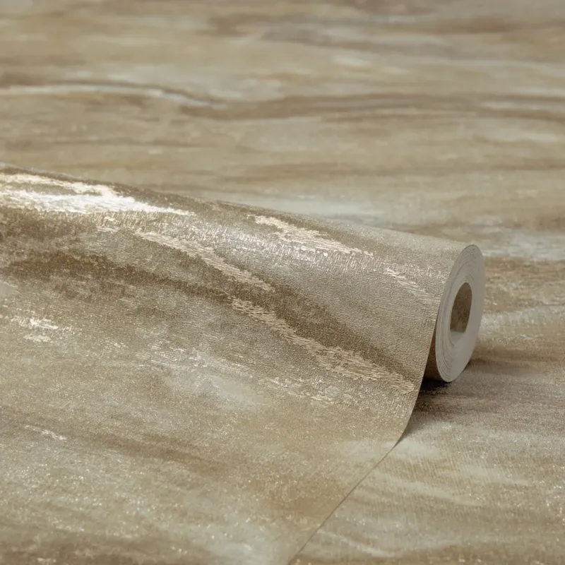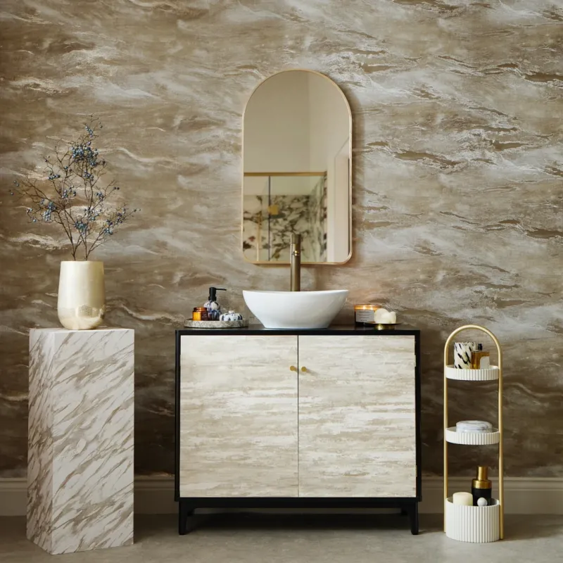 Beguilingly opulent, Nirvana Metallic mesmerises with liquid waves of grey and taupe intertwined with champagne. Its swirling patterns, reminiscent of shimmering marble, cast a spell of mystique, evoking a sense of fluid movement. Sophisticated shades create a harmonious balance, transforming living spaces, bathrooms and bedrooms into sanctuaries of timeless elegance. Why not adopt an urban aesthetic by pairing this marble wallpaper with raw materials such as exposed brick, concrete and metal accents? Or, embrace simplicity by keeping the decor clean and minimal.