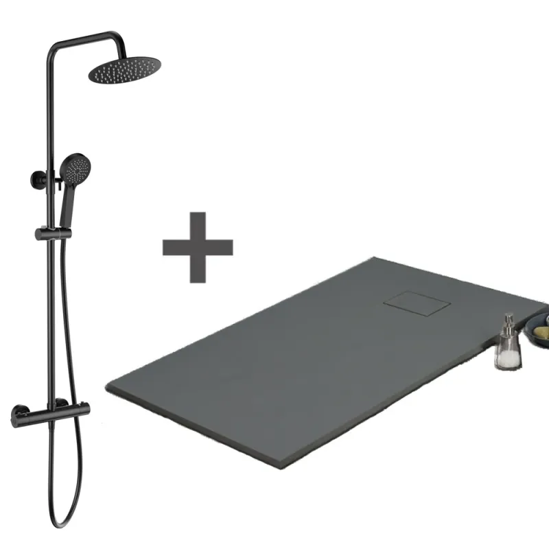 Pack contenant un receveur de douche further plat PIATTO en SoliCast® gris basalte accompagné d’une colonne de douche de finition chromée ou noir mat, pour une douche à l’italienne ultra-contemporaine.