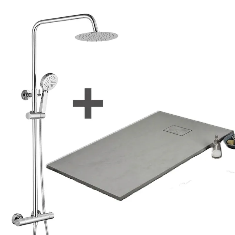 Pack contenant un receveur de douche additional plat PIATTO en SoliCast® gris accompagné d’une colonne de douche de finition chromée ou noir mat, pour une douche à l’italienne ultra-contemporaine.