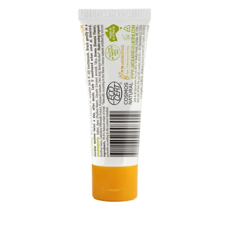A Pasta de Dentes Jack N’ Jill com sabor a fruta biológica, torna a escovagem dos dentes divertida para as crianças. Tem apenas ingredientes naturais, incluindo 40% de xilitol e calêndula que ajudam a acalmar as gengivas e a combater a cárie dentária.