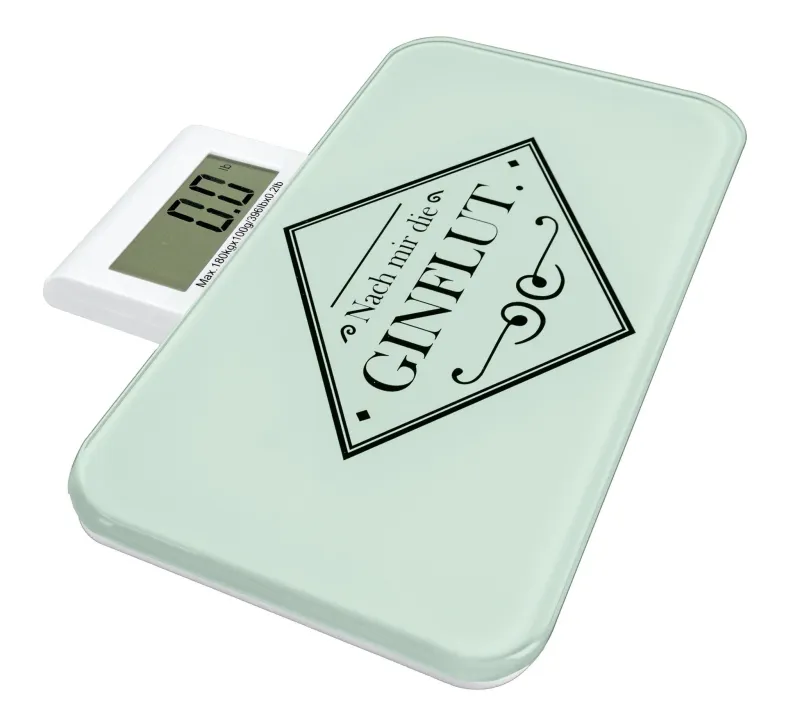 Die Personenwaage GIN WAAGE Distinct kombiniert stilvolles Design mit moderner Funktionalität und sorgt für frischen Schwung im Badezimmer. Die rechteckige Form mit abgerundeten Ecken und die satinierte Glasoberfläche in zartem Glasgrün verleihen der Trittfläche eine elegante, leichte Optik. Das dekorative, rautenförmige Element mit dem augenzwinkernden Schriftzug Nach mir die GINFLUT setzt einen markanten Akzent und macht die Digitalwaage zum Blickfang. Ein gut ablesbares Digitaldisplay mit klaren Ziffern ermöglicht eine komfortable Gewichtskontrolle im Alltag. Dank der kompakten Größe (LxBxH) ca.: 125 x 225 x 20 mm lässt sich die Waage flexibel platzieren und nach Gebrauch platzsparend verstauen, bei einem Gewicht ca.: 528 g und hochwertigem Material: 100% Glas/Plastik/Metall.