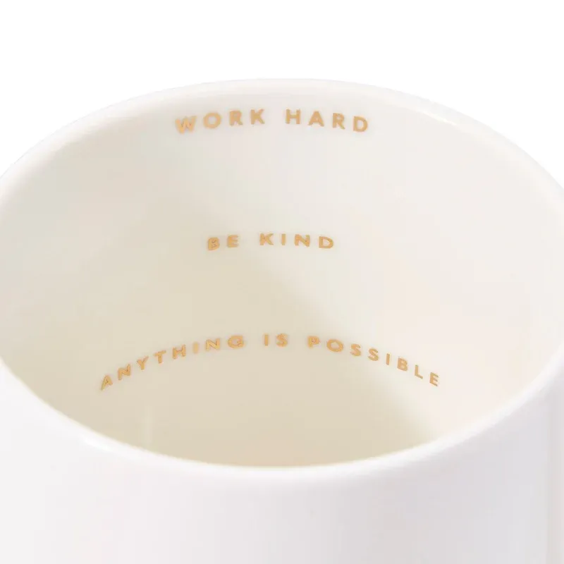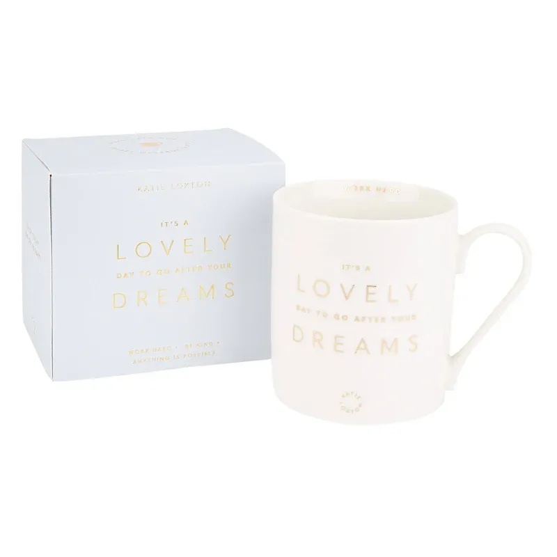This fine pearl Porcelain Mug is decorated with gold lettering inside and out! On the front are the words” It’s A Lovely Day To Go After Your Dreams”, while inside reads “Work Hard. Be Kind. Anything Is Possible”.