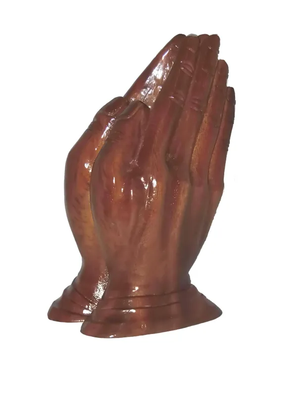 Carefully crafted artisanal ornament showing hands in preying position, carved from solid wood.