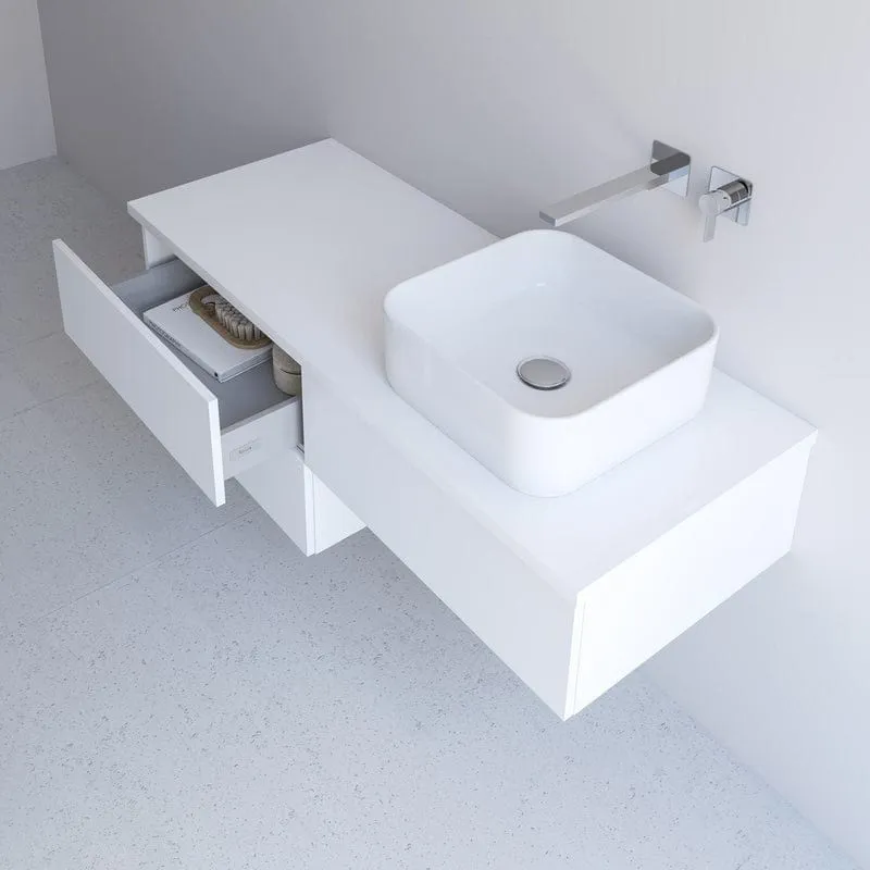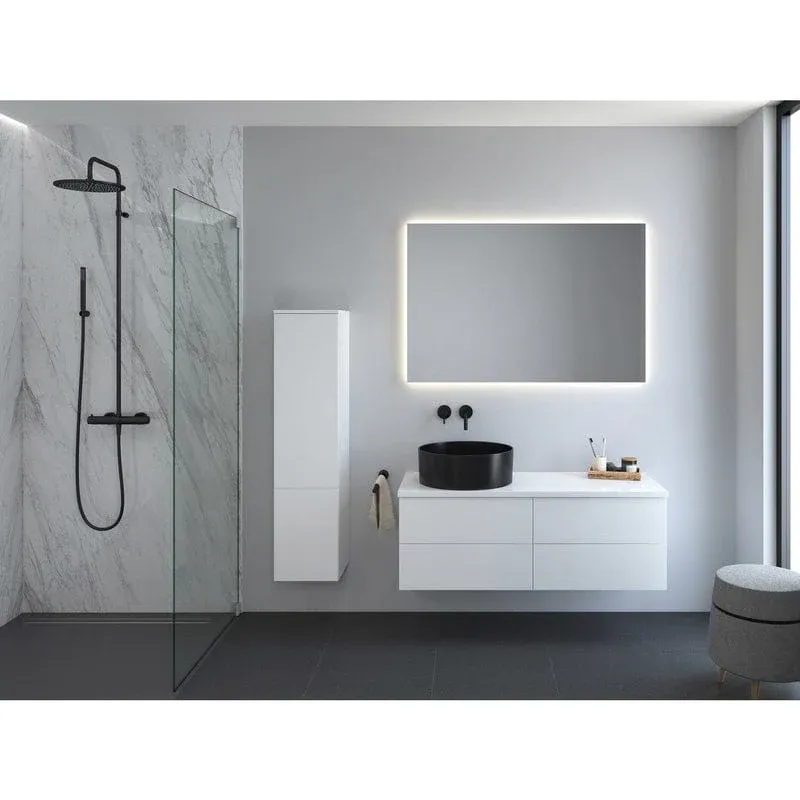 La console de lavabo KRONENBACH Cube (121 cm) avec 4 tiroirs et système TIP-ON séduit par son design moderne, son élégance sans poignées et son agencement fonctionnel – un espace de rangement élégant pour toutes les salles de bains.