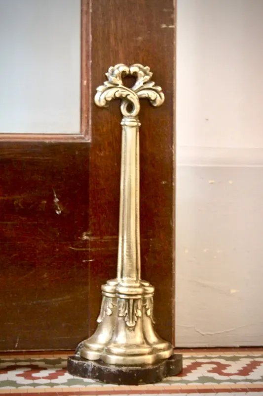 A Regency golden metal bell-shaped doorstop with acanthus handle.