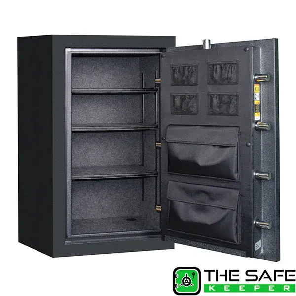 ProSteel PS13 home reliable is designed for secure storage of valuables. With external dimensions of 42″H x 24″W x 21″D and interior dimensions of 37″H x 20.5″W x 14″D, this safe offers a volume of 13 cubic feet and weighs 330 lbs. Fire protection provides 80 minutes of protection at 1,550°F and 95 minutes at 1,200°F. Constructed with 14-gauge steel, the PS13 ensures robust security with nine locking pins, six of which are active, and a fully reinforced door frame.