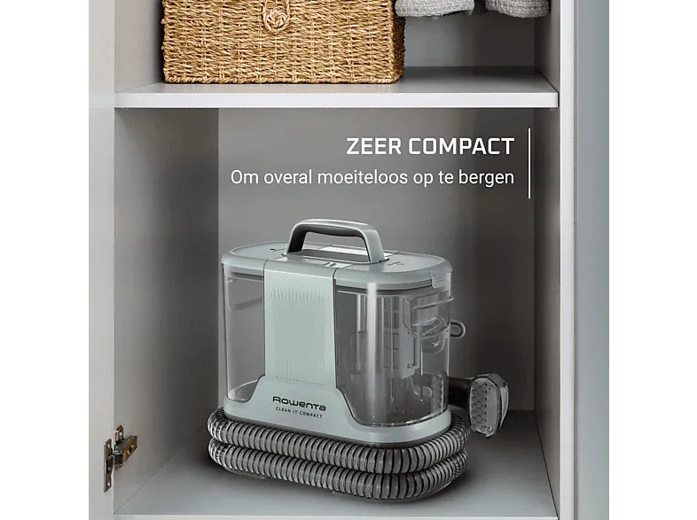 Le nettoyeur de tapis Clean It Space-saving IN3020 de Rowenta en coloris eucalyptus élimine les taches et la saleté sur les tapis, les tissus d’ameublement et les intérieurs de voiture. Avec 400 watts de puissance, un réservoir d’eau propre de 1,4 litre et un réservoir d’eau sale de 0,85 litre, tu traites aussi bien les petits incidents que les taches tenaces causées par tes animaux. La brosse combinée convient aux tapis et aux sols durs, tandis que la tête de pulvérisation amovible permet un nettoyage ciblé. Grâce à l’accessoire auto-nettoyant, l’entretien de l’appareil reste limité, et le câble d’alimentation de 4 m t’offre une bonne liberté de mouvement. Une solution compacte et facile à utiliser, sans fonction vapeur.