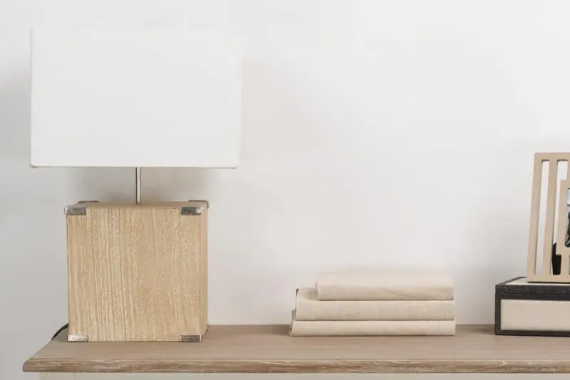 Light up your surroundings with our Kostka Wood and Fabric Lamp. Constructed from genuine mangga wood, this indoor lamp combines natural wood grain with a cream-colored shade for intuitive integration into a multitude of settings. Zen-like in its singularity of purpose and simplicity of execution, the Kostka lamp expertly expresses the discount-furniture dharma. Metal-reinforced corners add style and sturdiness.