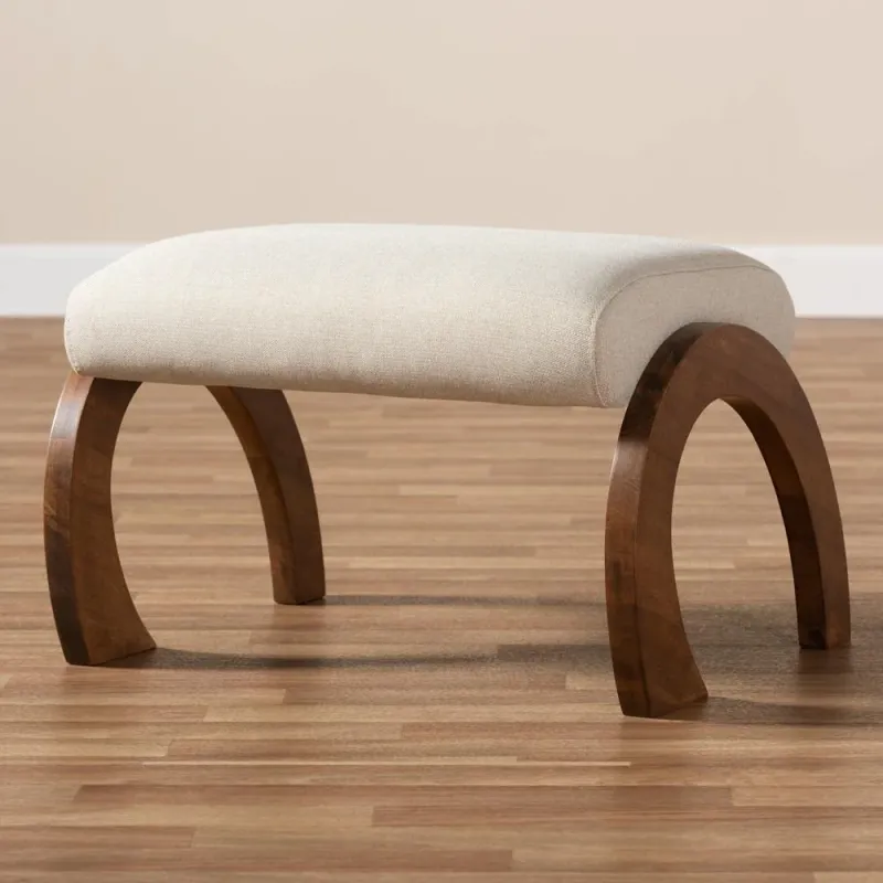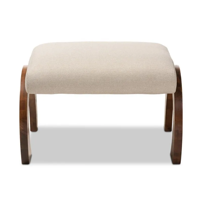 Add some excitement to your space with the Sandrine ottoman. The modern and contemporary-inspired design comes through in its solid coloring and unique silhouette. The Sandrine features curved, arched legs in an energetic, swooping design. The legs are walnut-finished solid rubberwood, giving this ottoman lasting stability. The seat of the Sandrine is foam-padded and upholstered in featherlight khaki fabric. This ottoman will be a great conversation starter and statement piece for use in your livingroom, entryway, or other shared spaces. Made in Malaysia, the Sandrine requires assembly.