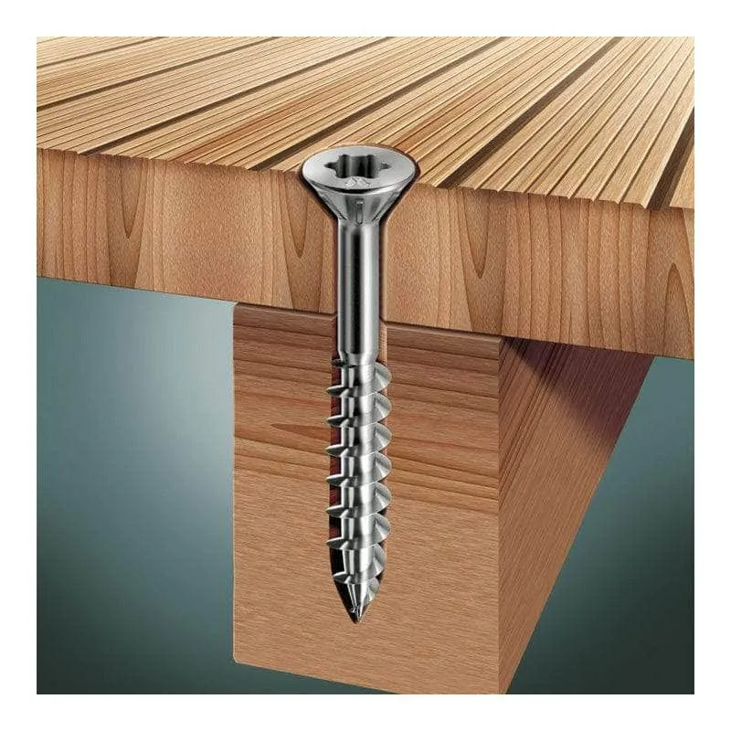 Tête réduite avec nervures fraisantes et empreinte TX fraise et évite la fissuration du bois en phase de serrage.