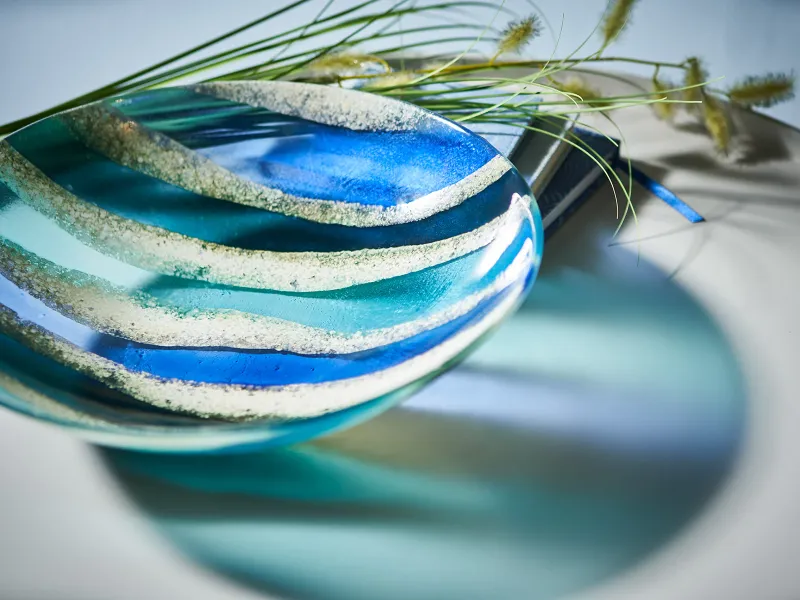 A stunning fused glass dish inspired by the Cornish shores with frothy opaque whites and light-diffusing sea blues. Handmade at our Cornwall studio. Ideal gift for someone special.