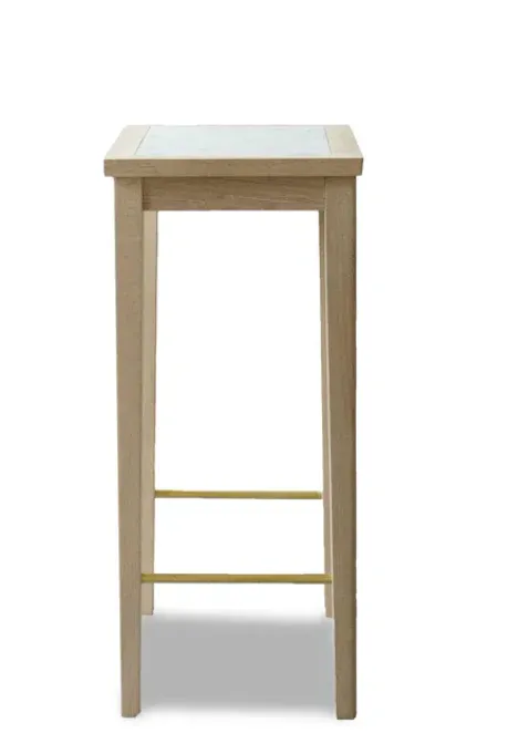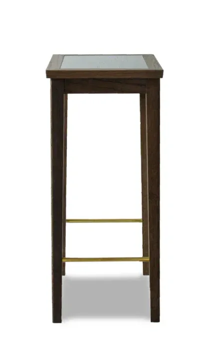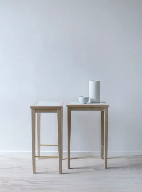 Originally, the side table was made with a black glass plate in the centre of the table top, emphasising the minimalist design. Today, the benchtop is also available in ivory marble and soap finish that complement the wooden structure.