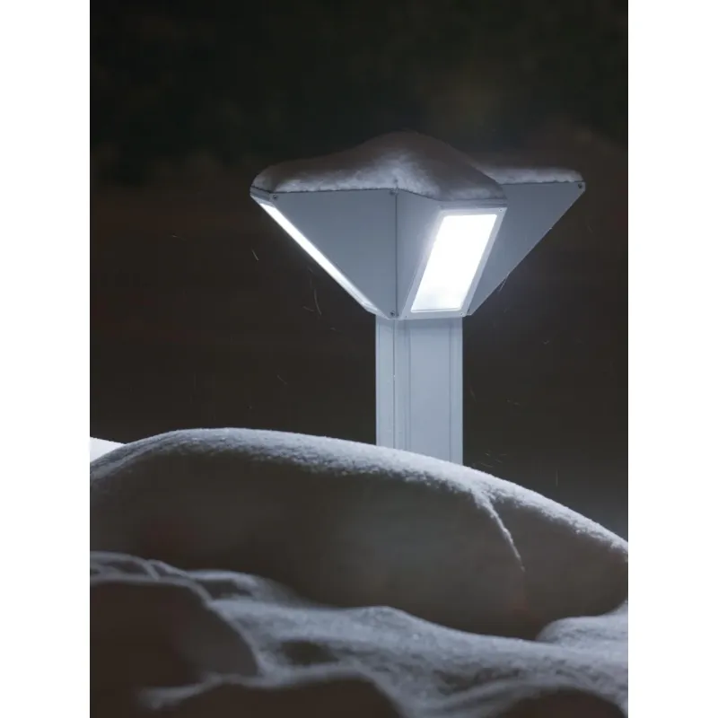 Struttura in pressofusione di alluminio. Diffusore in vetro satinato. Installazione a parete o palo. Controbase e accessori per il fissaggio. Portalampada in porcellana con attacco E27. Altezza lampada: max 130mm Lampada esclusa. Alimentazione 230V ~ 50Hz. Classe di protezione: IP65 Potenza massima lampade: 26W