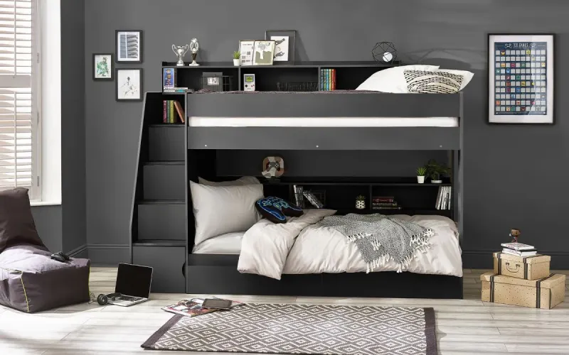 Camelot Staircase Bunk is a bunk bed created with revolutionary and functional construction. With spacious storage in the stairs, bottom bunk, top bunk and additional storage drawers at the bottom of the bunk – you’ll never be short on space! Finished in an readily wipeable anthracite, the Camelot keeps your childs room looking clean and fresh with minimal upkeep, and will suit any decor style.