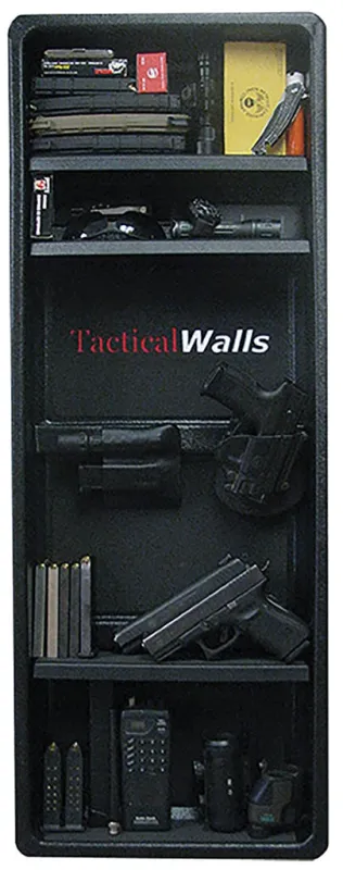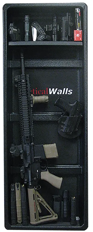 The Tactical Walls 1440 Wall Insert fits flawlessly in the wall in between standard 16″ on center wall studs. It helps organize your rifles and will fit up to 2 rifles depending on the magazines and optics mounted on each. It can also hold multiple pistols. Other accessories can fit easily in your insert for added storage options including flashlights, knives, magazines, and more.