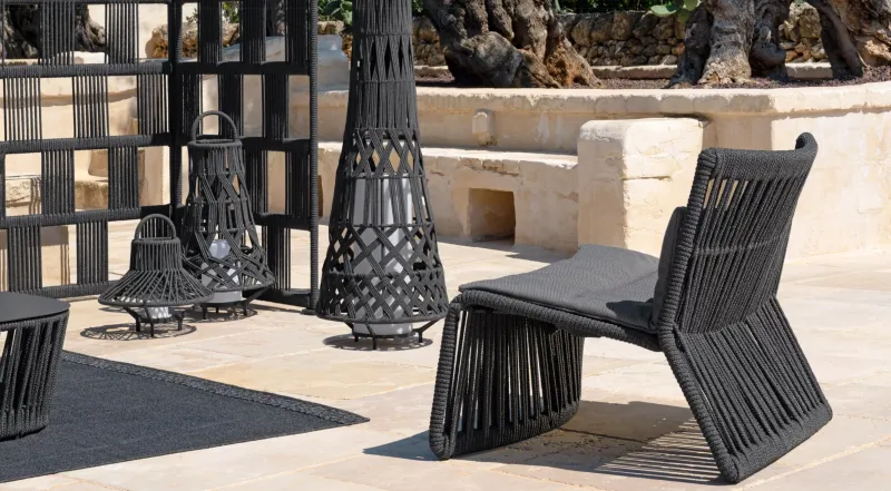 The detailed armchair is supported from a reinforced structure with braided hawsers, emblematic sign of the elements of this collection.