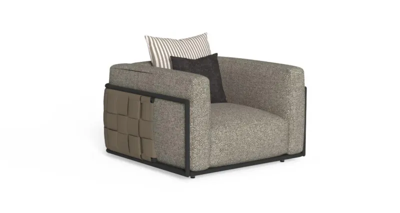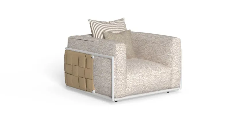 From the study of the cube as a primordial form, features the sophisticated design of the Tressè armchair. The woven eco-leather bands that embrace the perimeter of the seat are the distinctive feature of this piece of furniture, which conveys a reassuring feeling of comfort and solidity. The soft and imposing cushions are highlighted by the fine finishes and the tubular aluminium structure. Available in silk grey, mud and Sienna, this armchair is the ideal outdoor solution for your garden or outdoor living room.