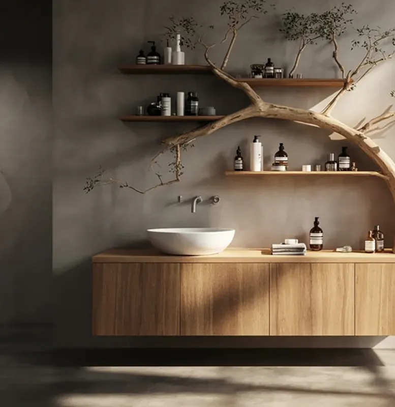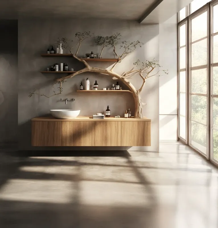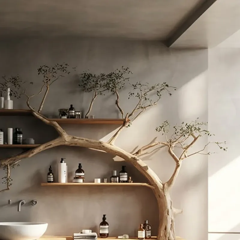 Tree Branch Bathroom Vanity & Floating Shelves – Solid Wood ★ Weight capacity: 300 pounds – solid support ★ Vessel sink style – modern bathroom aesthetic → Install Your Dream Sink Now