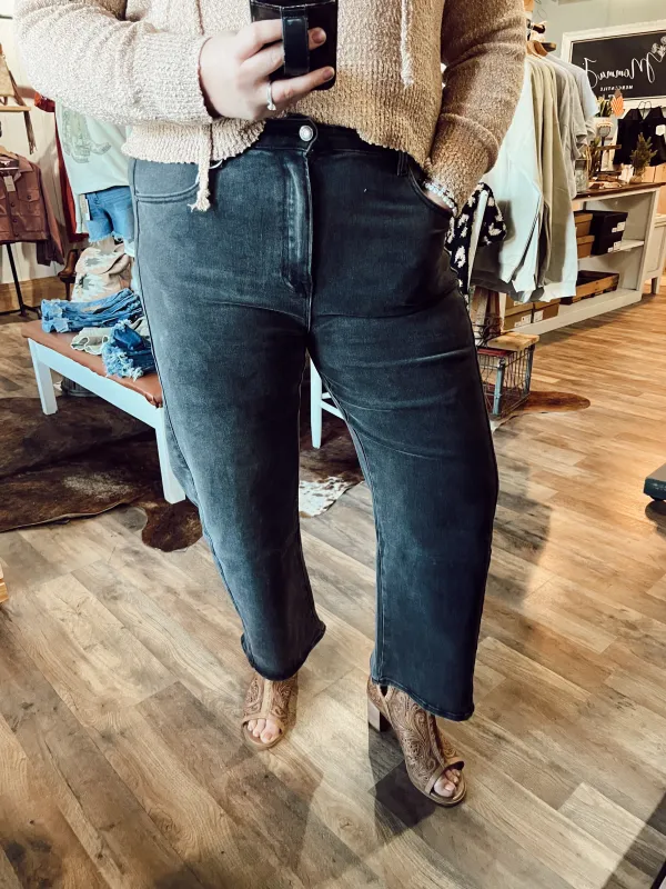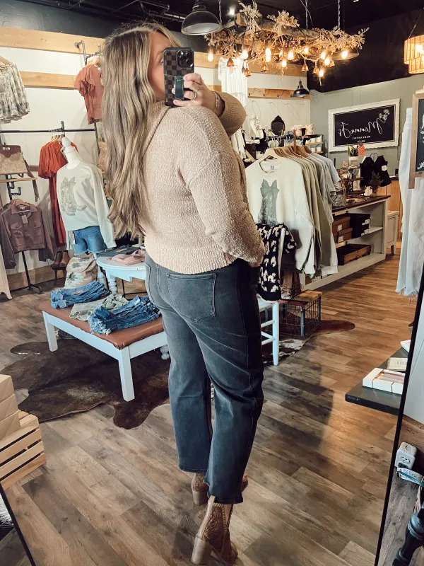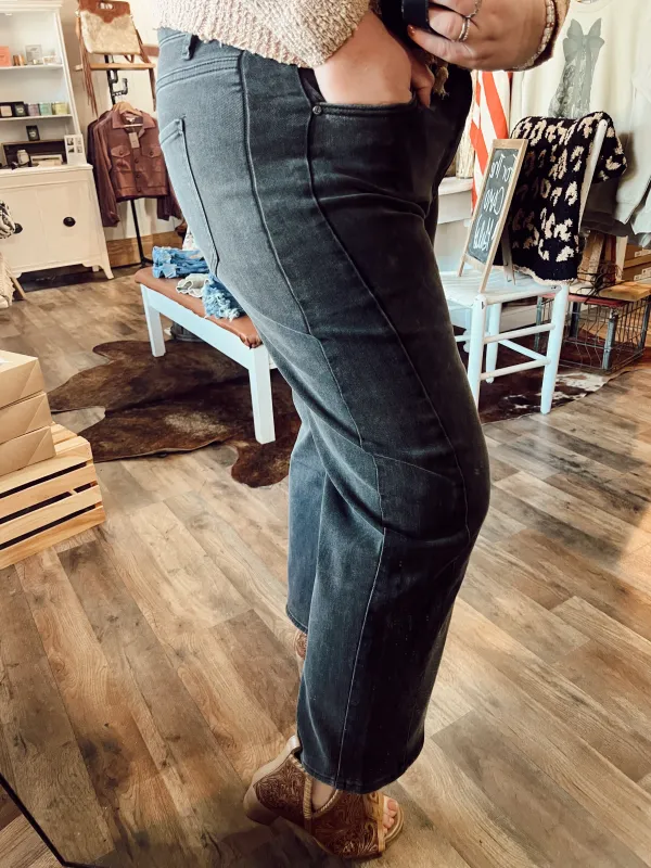 TWO TONE SIDE PANEL BARREL CROP JEAN