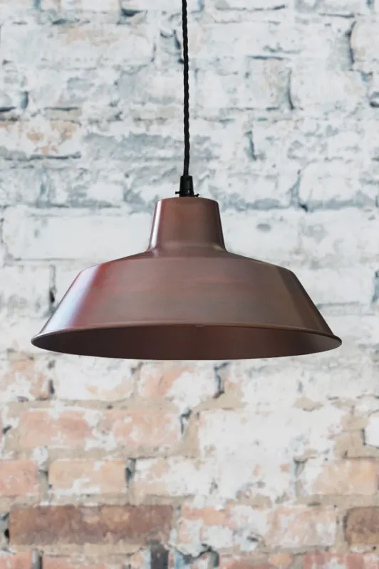 Inspired by classic lighting of days gone, the Aged Copper Factory Pendant Portable brings a rustic charm to a nostalgic shade. Made from solid copper, this shade has been fired for an true aged look. This pendant comes with a choice of seven suspension cord options. Create your own unique look with optional shade covers. Hang this light anywhere in a farmhouse or rustic styled kitchen in an Edwardian home or similarly styled commercial space.