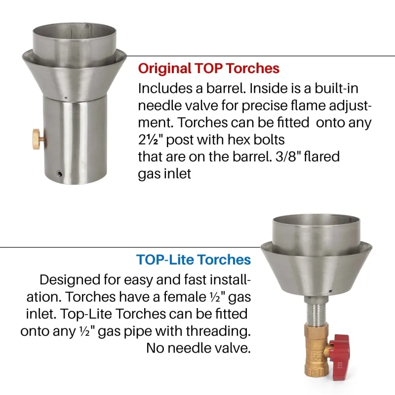 The ROMAN Fire Torch is compatible with Pure Gas and Liquid Propane. You can choose form two torch base options – The Original TOP base or TOP-LITE base Original TOP Torch Base: Built-in Needle valve for precise flame adjustment, torches can be fitted onto any 2 1/2″ post with hex bolts, 3/8″ flared gas inlet. TOP-Lite Torch Base: </s Only logged in customers who have purchased this product may leave a review. Recently Viewed Products