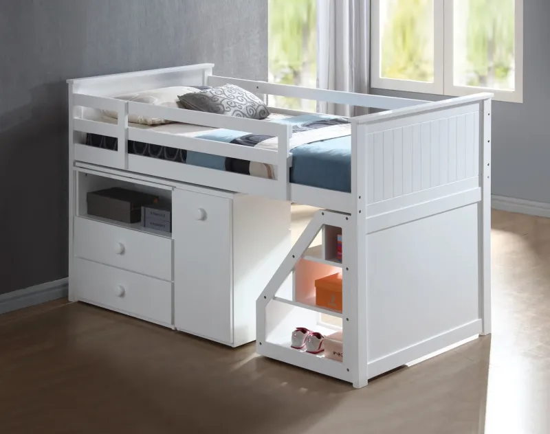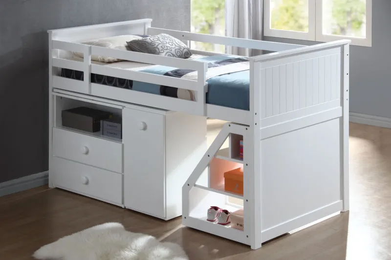 - The sleek white finish and clean lines provide a modern and fresh aesthetic that complements any room decor. The lofted bed features an easy-access guard rail for safety and a interchangeable front ladder, making it both practical and stylish. Included with the loft bed is a multi-functional storage solution, featuring a 2-drawer chest, a swivel desk with 3 drawers, and a storage ladder with 3 open compartments, offering ample space for organization.